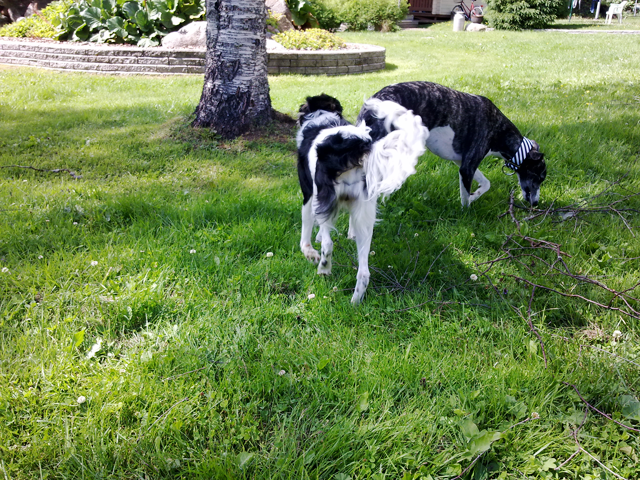 Sera on hieman arka, eikä meinannut ensin uskaltaa minunkaan lähelleni, mutta onneksi Rymy osasi käyttäytyä tosi nätisti, ainakin alkuun... Jossain vaiheessa alkoi sitten se ärähtely ja napsiminen, mikä on Rympälle (ja vissiinkin whippeteille) hyvin ominaista, Cocohan tekee täsmälleen samaa. Ensin neitikoira meinasi olla ihan ihmeissään, mutta niin vaan uskaltamista ja rohkeutta löytyi joka askeleella enemmän, eikä loppuvaiheessa enää noi Rymyn ärähtelytkään olleet niin pelottavia. Kuten